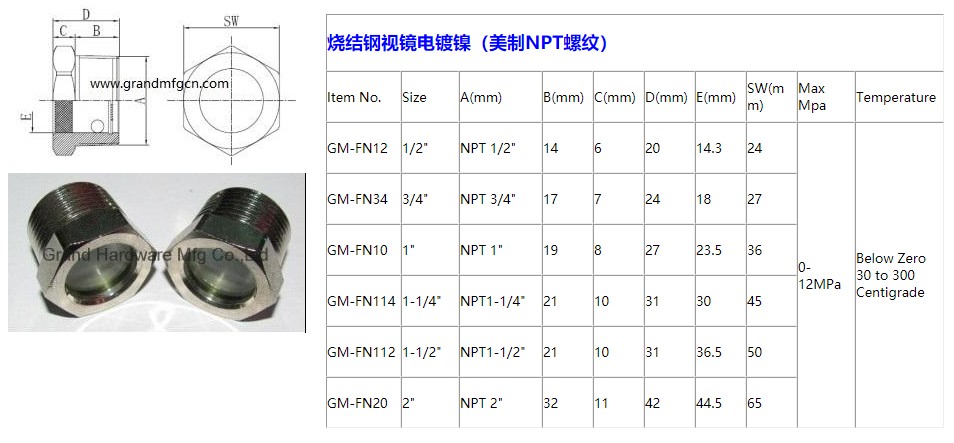 GrandMfg® 碳钢烧结钢视镜电镀镍(美制NPT螺纹)
